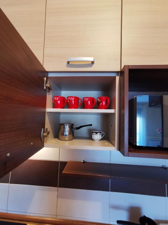 frižider, mikrotalasna rerna, kuhinja, električno kuvalo, posuđe, ploča za kuvanje, sto za ručavanje, čaše za vino