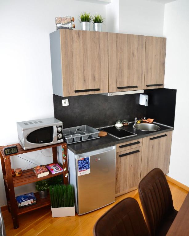 čajna kuhinja, frižider, mikrotalasna rerna, kuhinja, električno kuvalo, posuđe, ploča za kuvanje, toster, sto za ručavanje, čaše za vino
